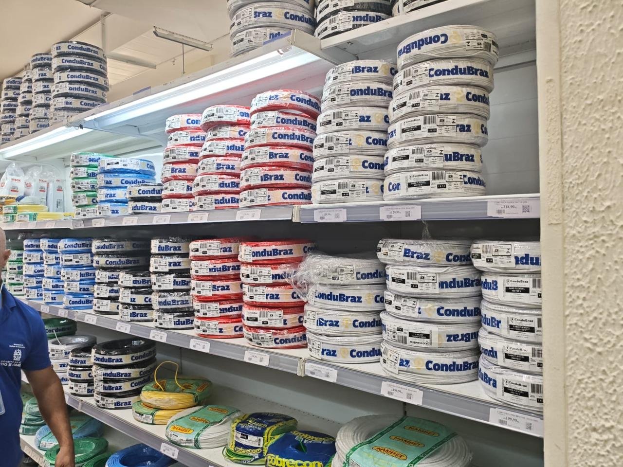 A equipe do Procon-RJ, com apoio técnico do SINDICEL, encontrou fios elétricos totalmente fora da norma em três unidades da Chatuba, uma das maiores redes de materiais de construção do Rio de Janeiro. O que chama a atenção é que os cabos estavam expostos como se fossem produtos regulares, com certificação e aparência de segurança.
